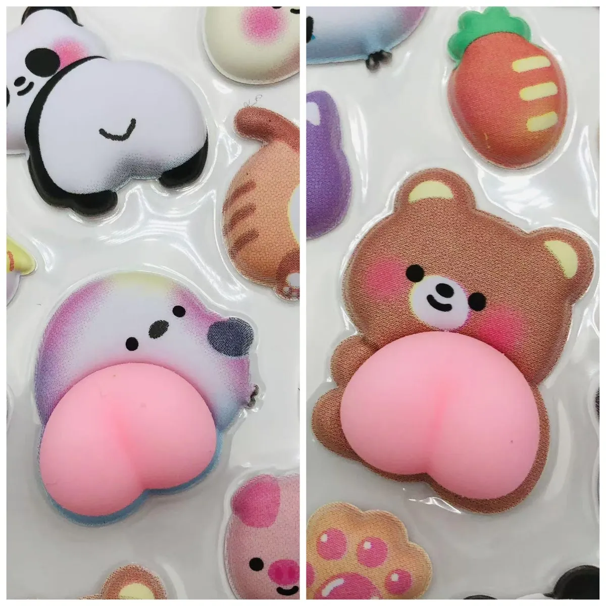 Erinevalt traditsioonilistest stressimänguasjadest on nende tagumikukujuliste stressi leevendavate kleebiste tagaküljel jääkideta liim, mis võimaldab neid kleepida ja taaskasutada nagu tavalisi kleebiseid. Neid saab kinnitada telefonide, arvutite, sülearvutite, veepudelite, kirjutuslaudade või mis tahes pinna külge, mida soovite kaunistada, ning need toimivad nii stressi leevendava mänguasjana kui ka ainulaadse isiksuse väljendusena.